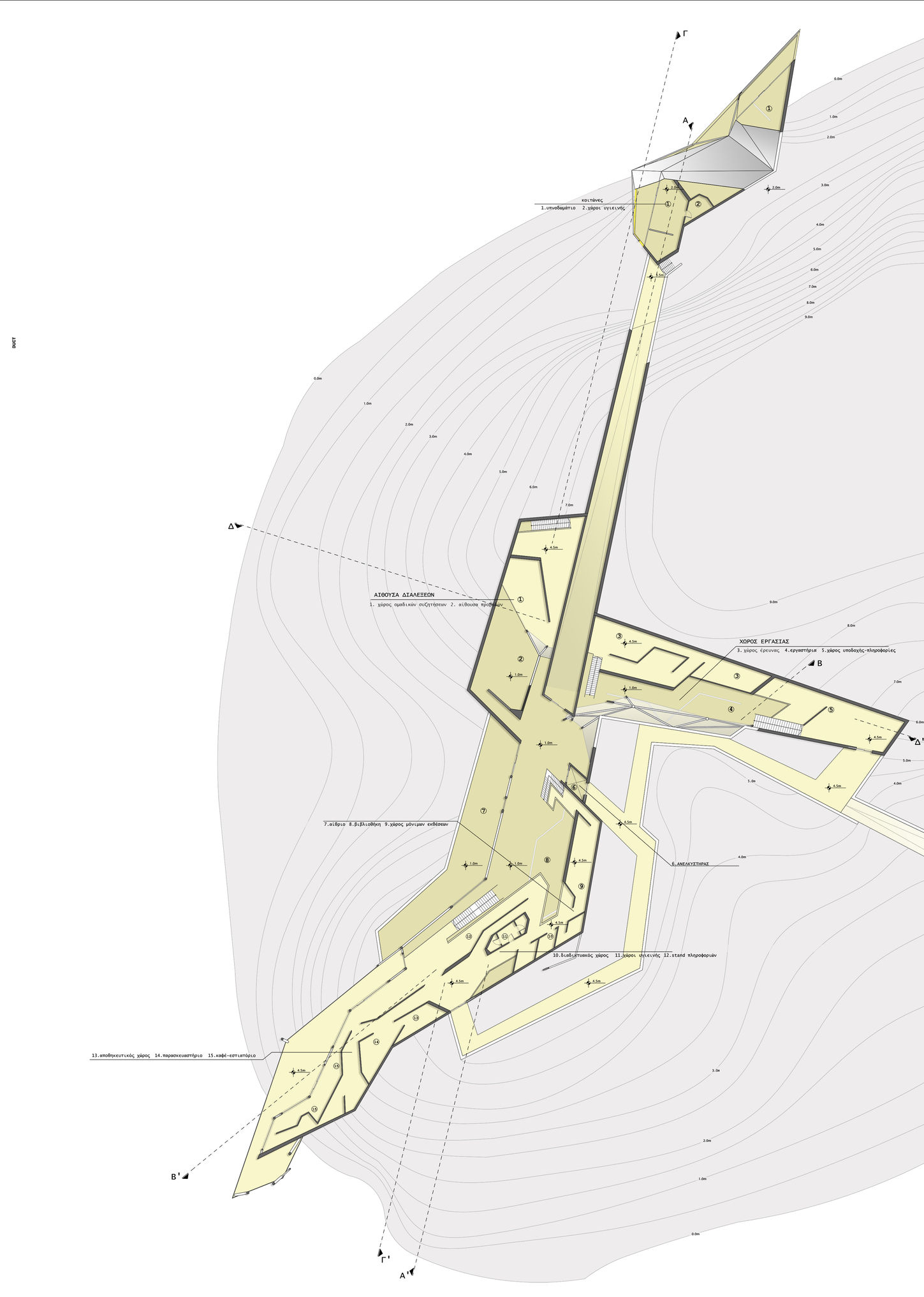 Στο κάτω επίπεδο αναπτύσσονται οι εργασιακοί χώροι, οι χώροι διαλέξεων και σεμιναρίων, η βιβλιοθήκη και το αναγνωστήριο, καθώς και ο χώρος περιοδικών εκθέσεων — λειτουργίες που συνδέονται άμεσα με την έρευνα και τη μελέτη. Στο ανώτερο επίπεδο, το καφέ-εστιατόριο, οι διαδικτυακοί χώροι και οι χώροι εκθέσεων ανοίγονται προς τον ορίζοντα, επιτρέποντας τη θέα προς τον Μαλιακό κόλπο και την κορυφογραμμή της Στερεάς Ελλάδας.